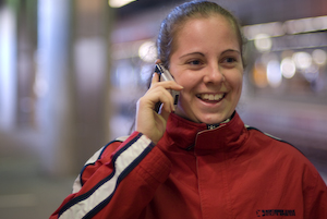 Evelina är verkligen fotograferad i farten. En bild som jag blev mycket stolt över, då det verkligen var en bedrift att både fånga själva mobilsamtalet i en talande stillbild och dessutom få henne skarpt avtecknad. Detta samtidigt som jag själv skulle försöka hinna med i samma takt fram emot ett efterlängtat möte vid norrlandsnattåget om morgonen på Stockholm central...